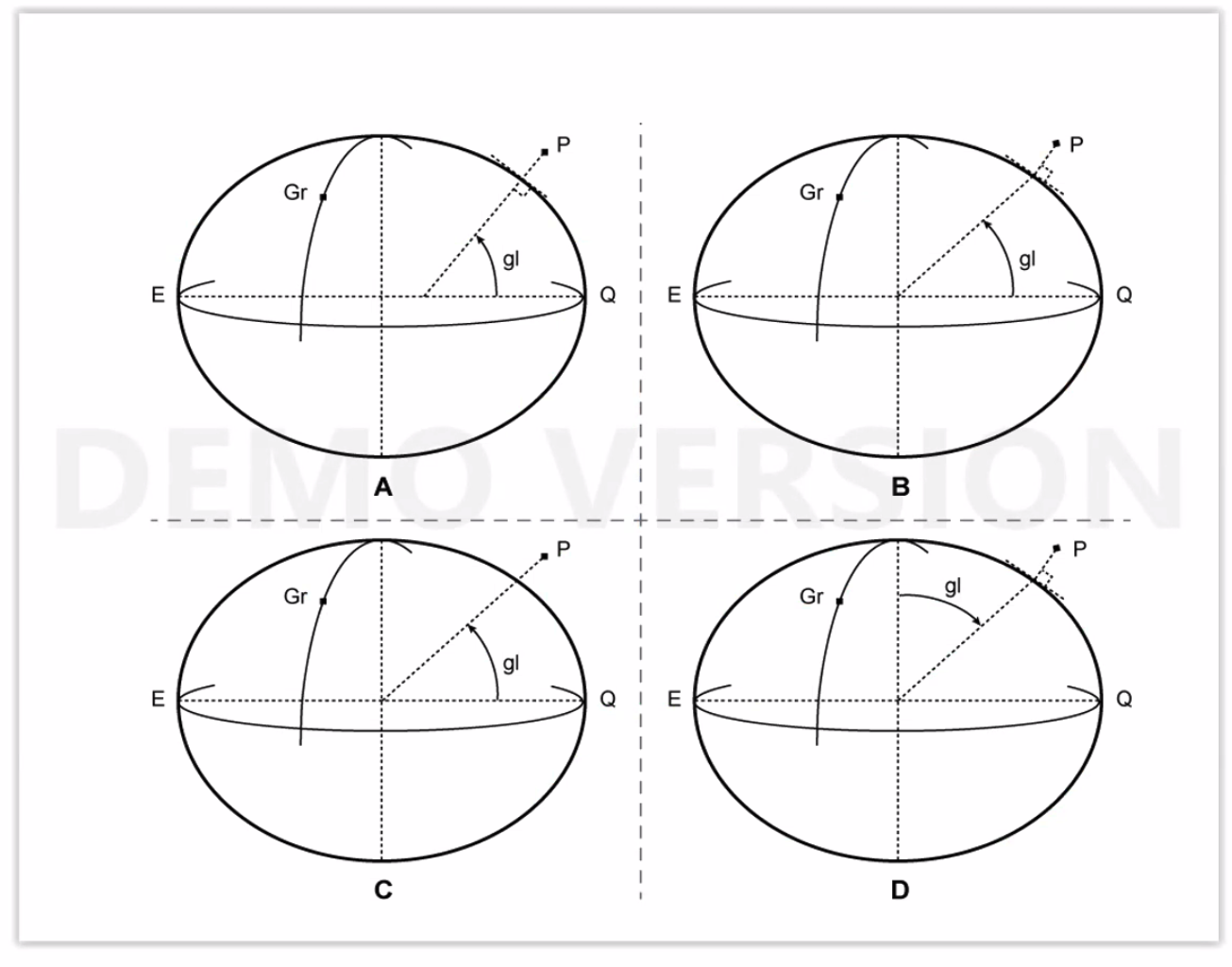 Q. Which figure in the diagram represents the geocentric latitude of position P, which is situated above the surface of the ellipsoid?