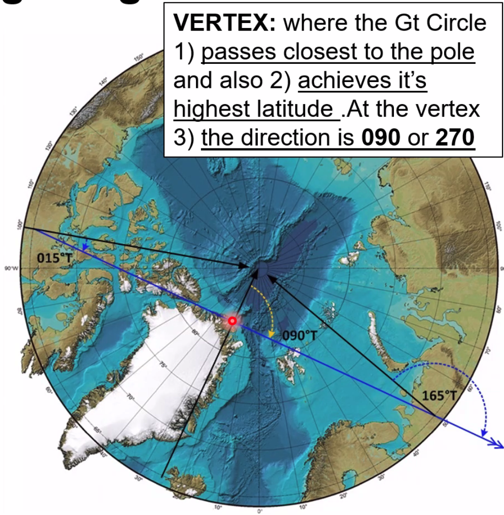 ==The vertex is where the great circle:==
