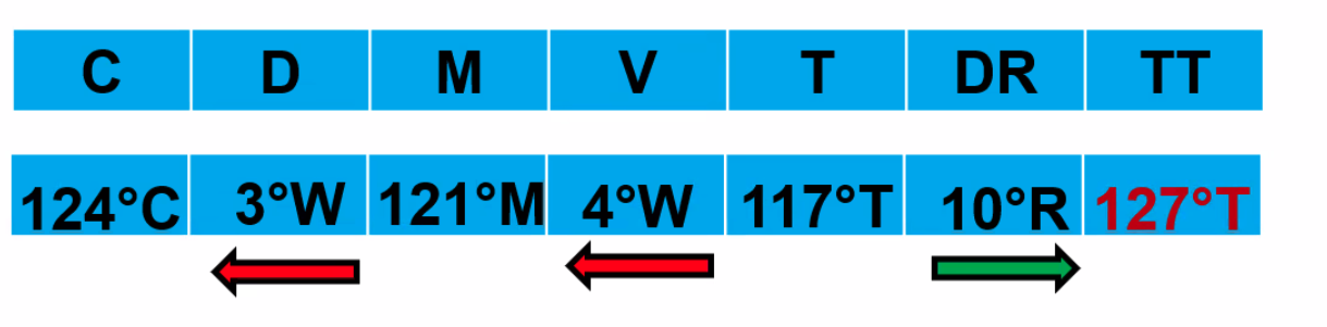 Q. Given compass heading = 124°, deviation = -3°, variation = 4°W. What is the true track given 10° starboard drift? A. 127°