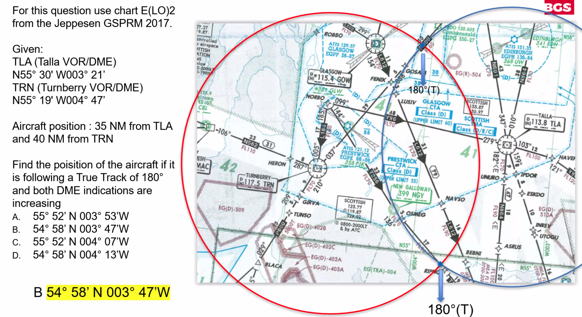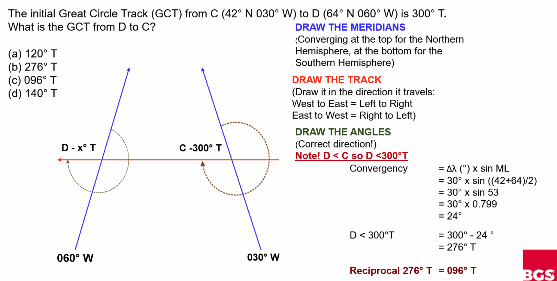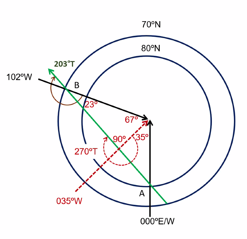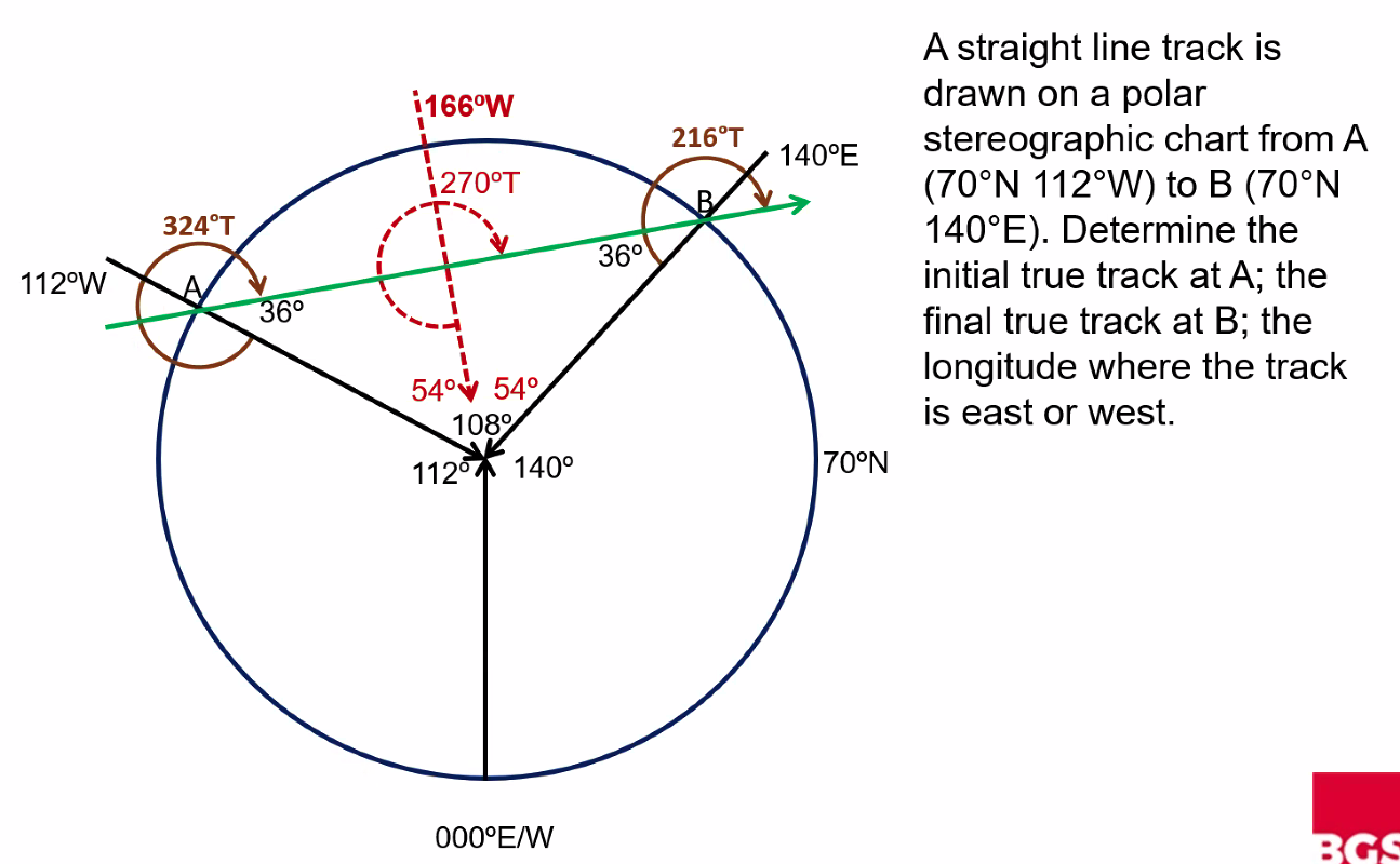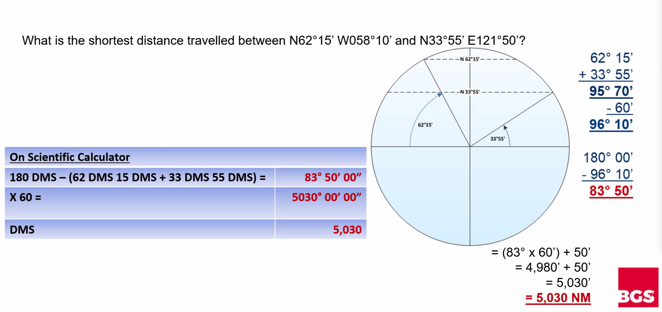 Q. What is the shortest distance travelled between N62°15’ W058°10’ and N33°55’ E121°50’? A. 83°50' OR 5,030 NM (because the longitudes equal 180° it is shorter to go over the poles)