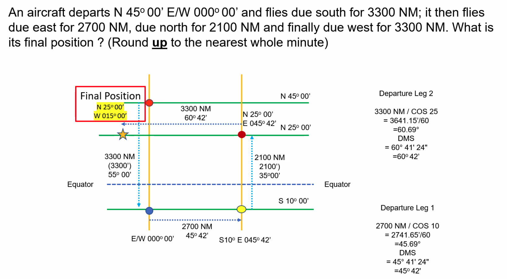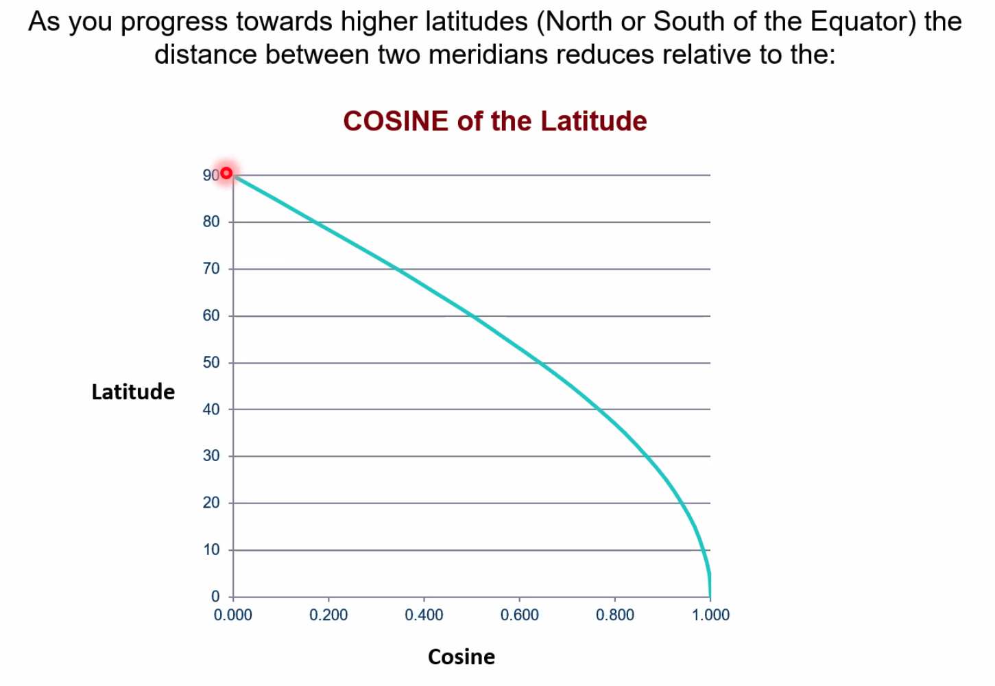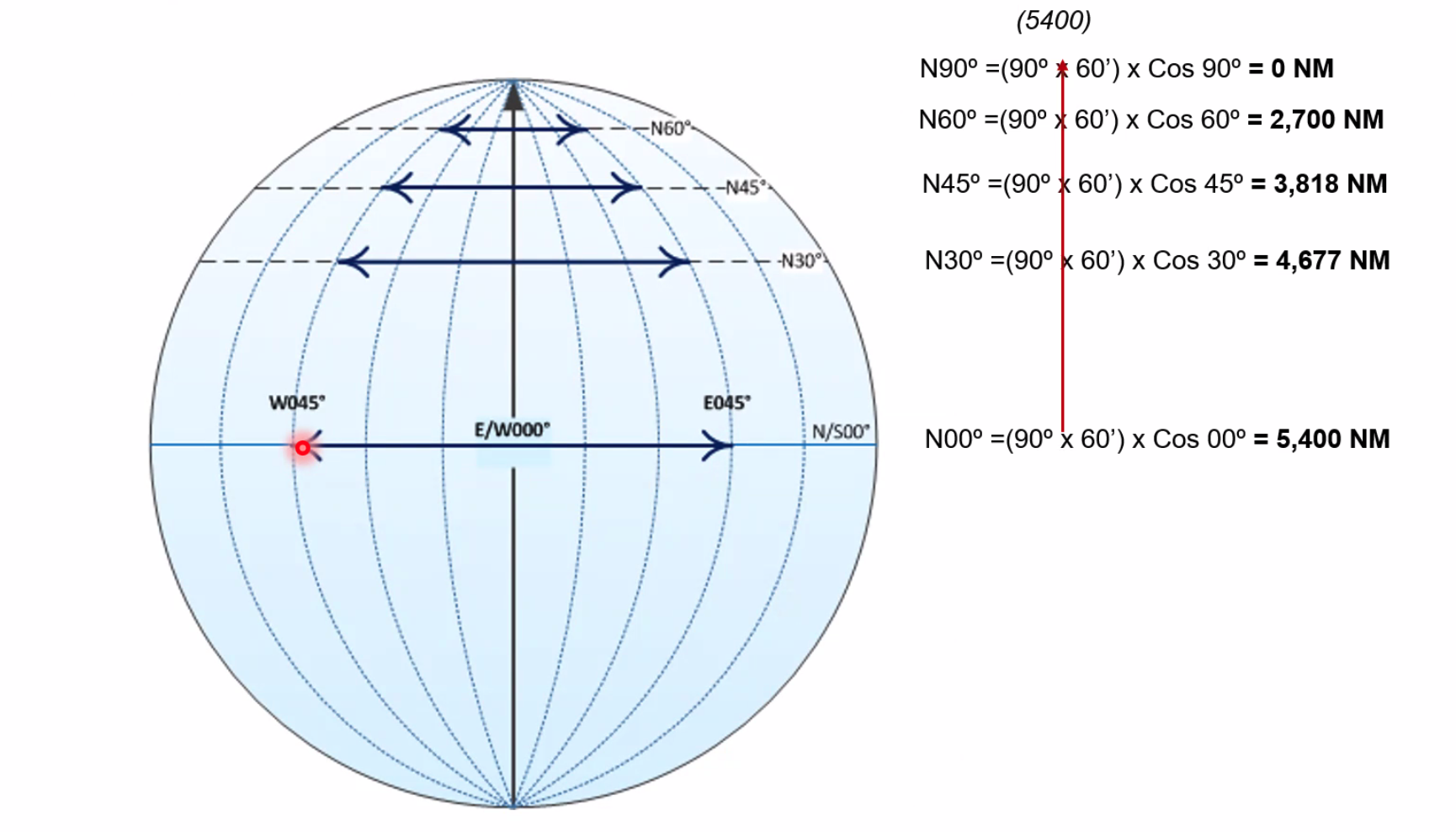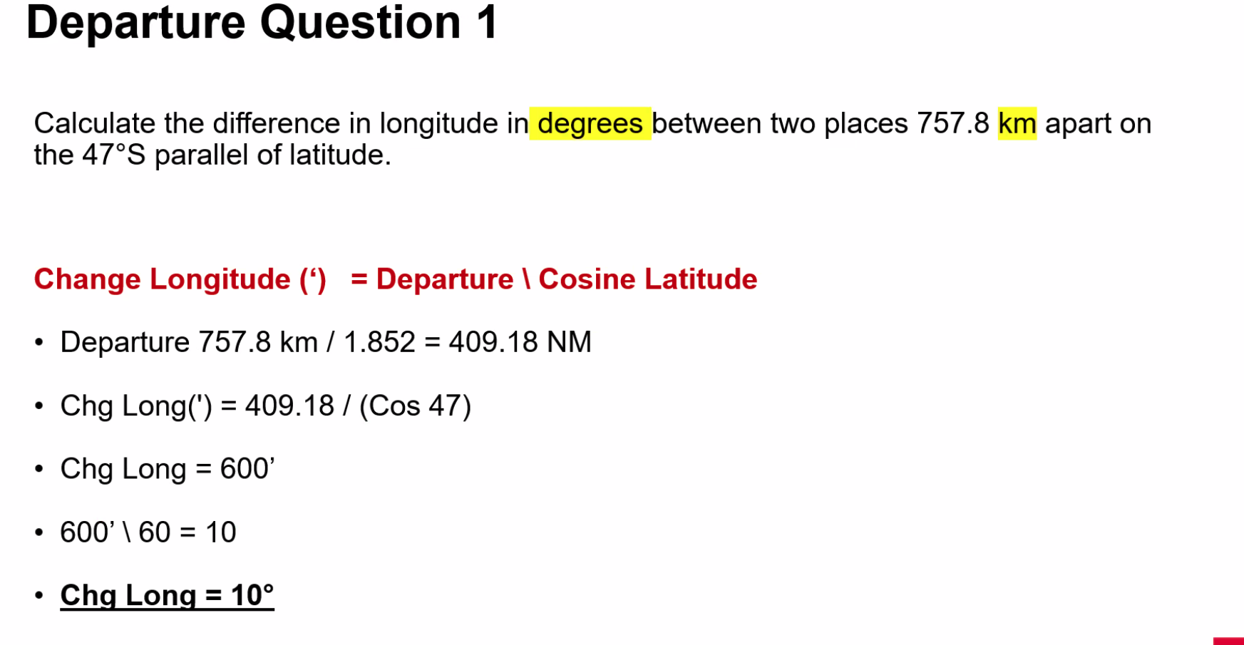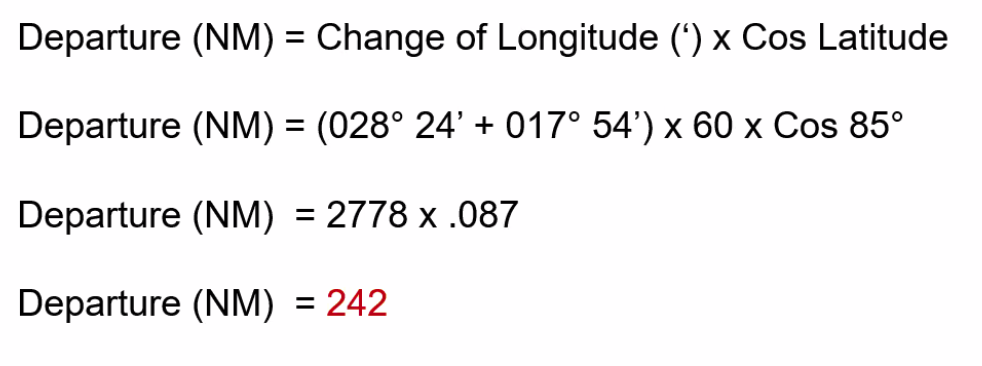 ==Departure (NM) = Change of Longitude (’) × Cos(Latitude)==