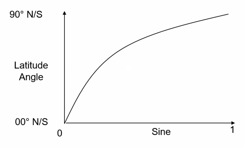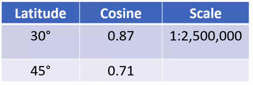 ==The lateral difference (distance) along a parallel of latitude differs depending on the latitude, reducing relative to the COSINE of the latitude.==