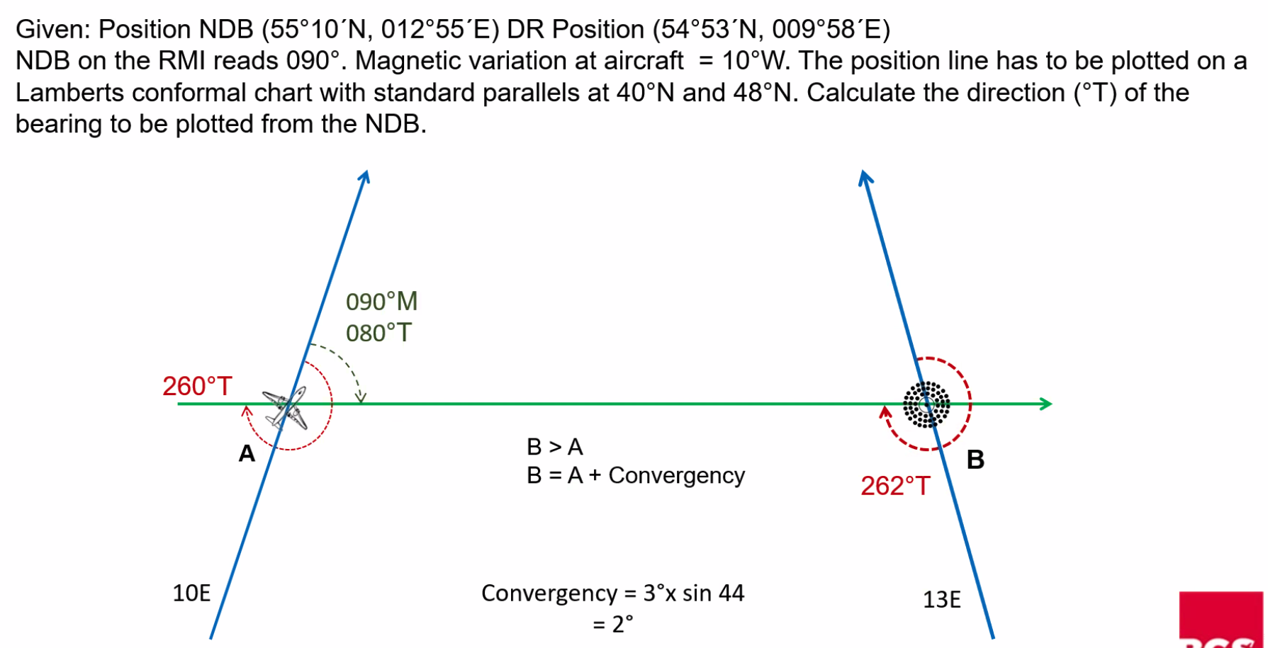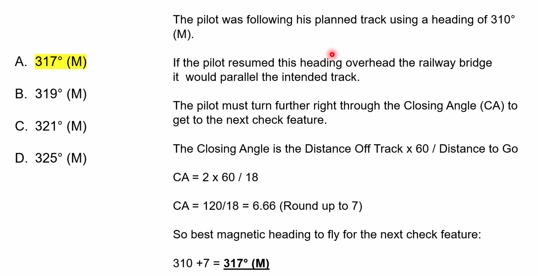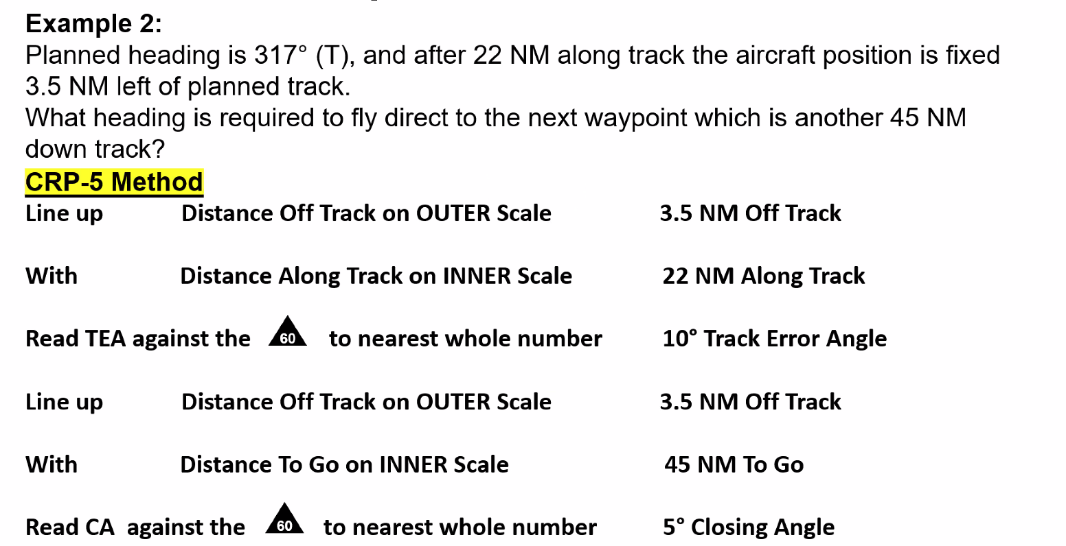 Q. Planned heading is 162°T and after 40 NM along track the aircraft position is fixed 2 NM right of planned track. What heading is required to regain track in approximately the same time as has taken to the fix position?