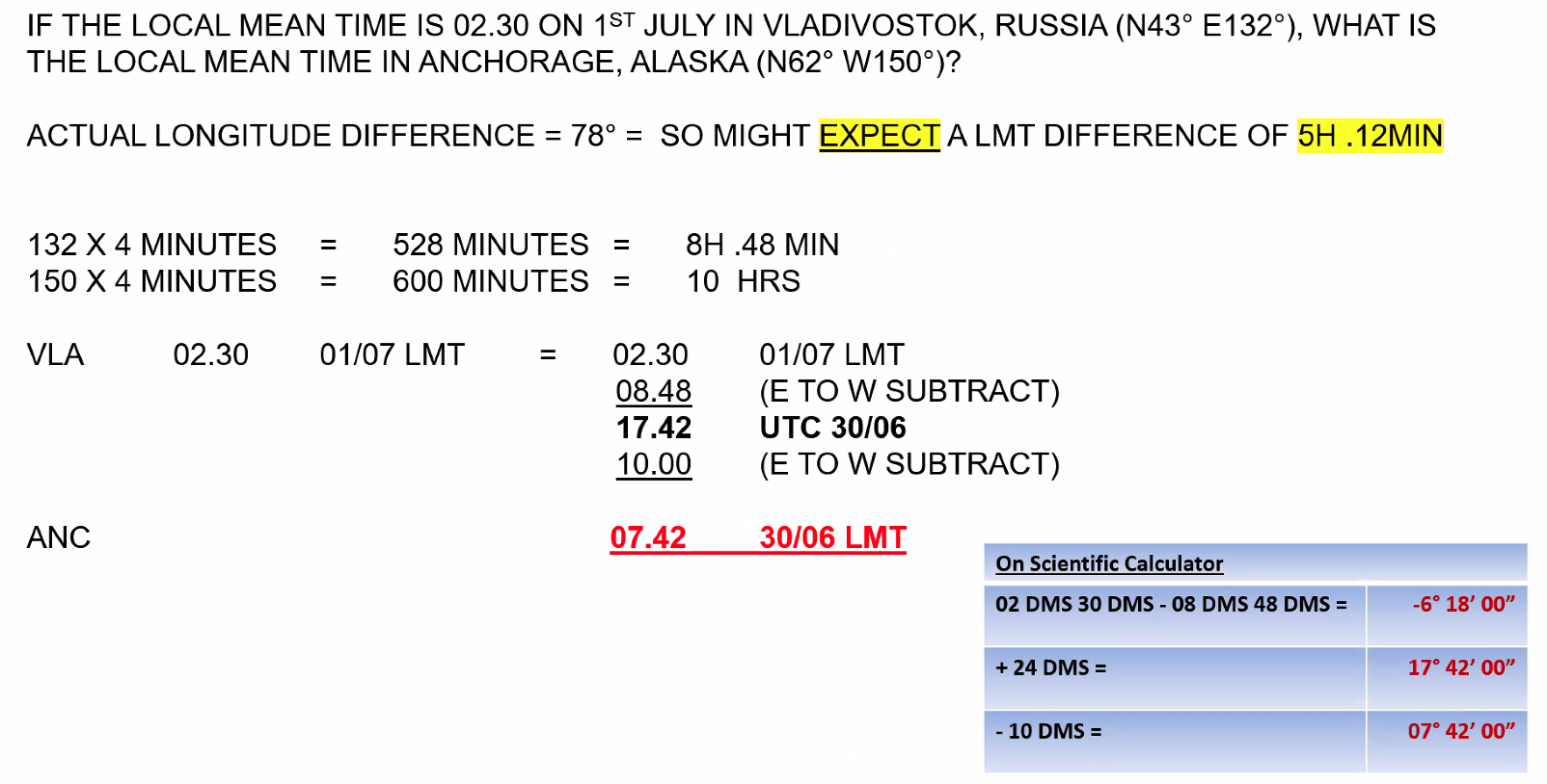 Q. If the local mean time is 02:30 on 1st July in Vladivostok, Russia. What is the local mean time in Anchorage, Alaska (N62° W150°)? A. 07:42 AM previous day