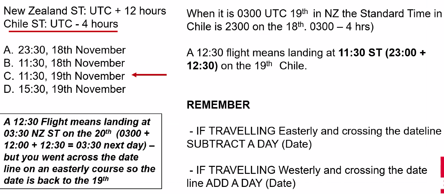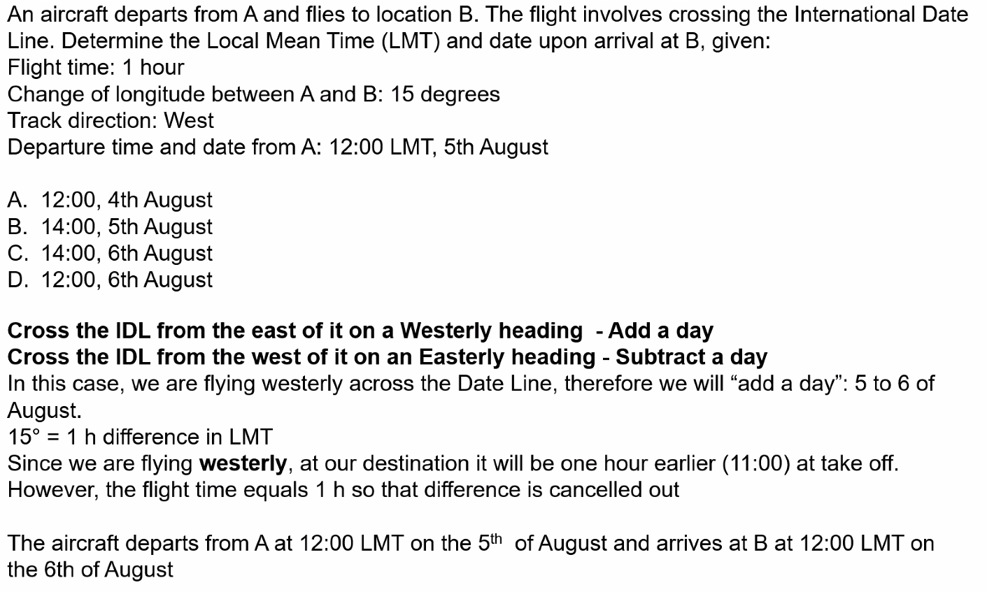 Q. An aircraft takes off from Guam (13°N 145°E) at 1900 Standard Time on 1st June local date. After a flight of 10 hours 15 mins it lands at Los Angeles (California USA). What is the Standard Time and local date of arrival (assume summer time)? A. 1215 on 1st June