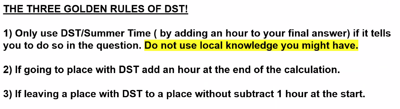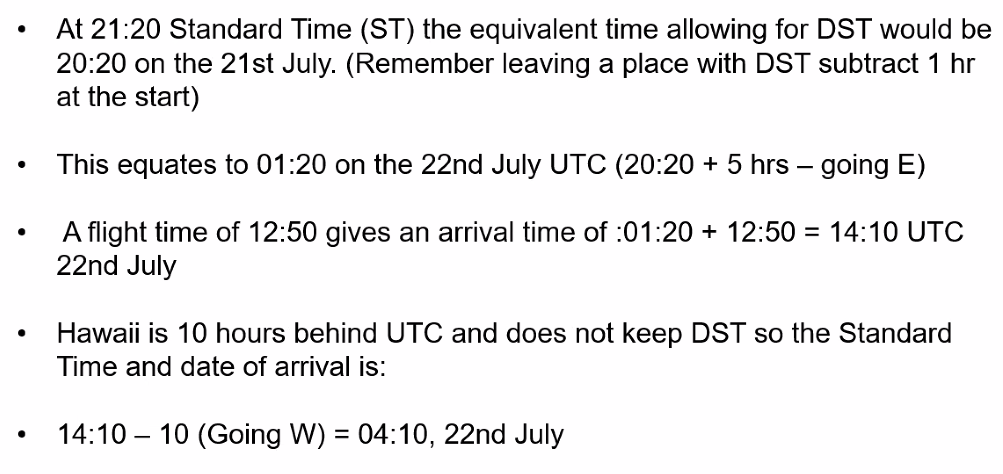 Q. An aircraft leaves New York USA, for Hawaii, USA, on the 21st July, 2018, at 21:20 Standard Time. Assume daylight saving time applies except for Hawaii. The flight time is 12 hours 50 mins. What will be the Standard Time and date of arrival? A. 04:10 22nd July