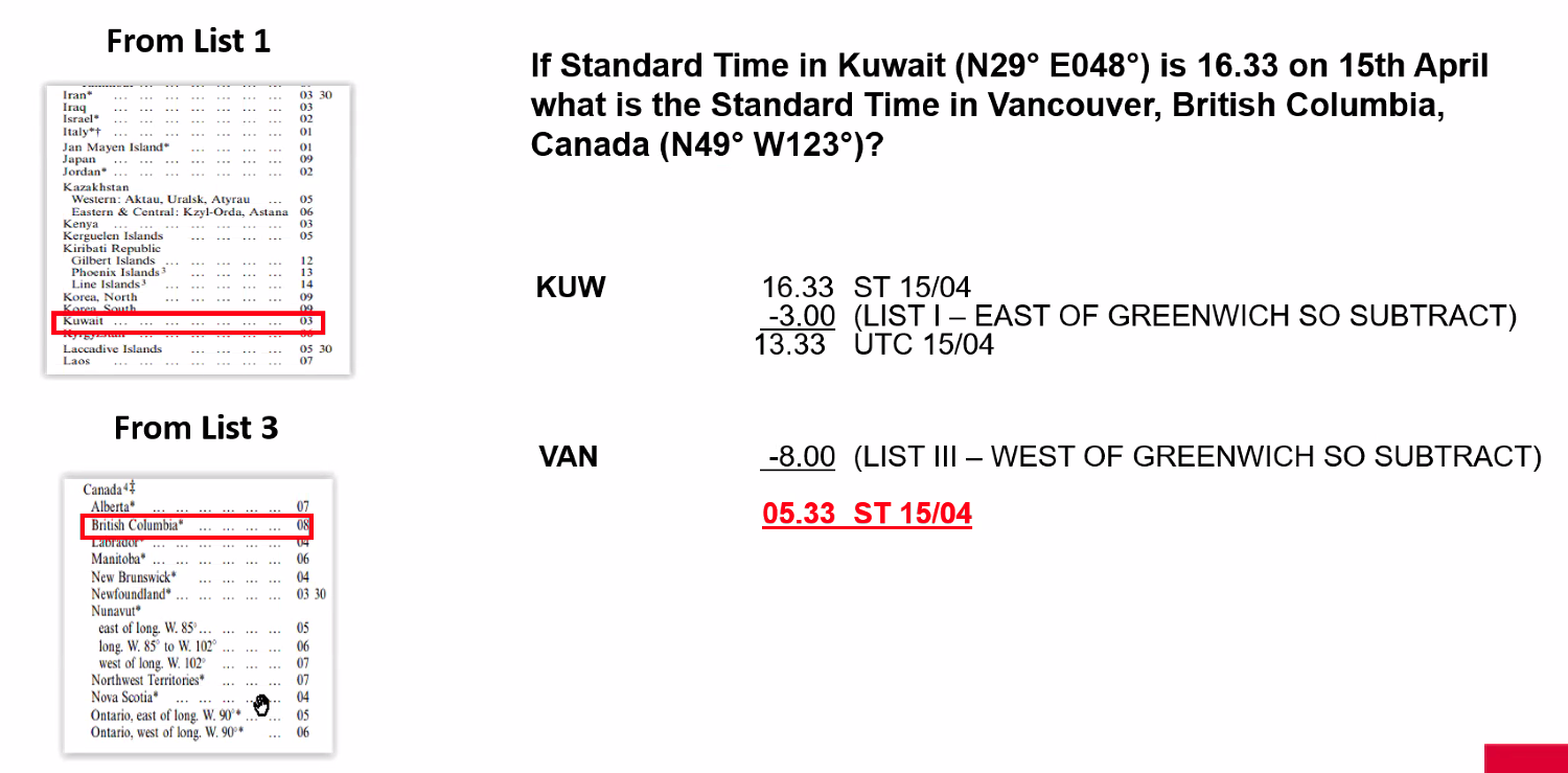 Q. If the standard time in Kuwait (N29° E048°) is 16:33 on 15th April. What is the standard time in Vancouver, British Columbia, Canada (N49° W123°)? A. 05:33 AM ST 15/04