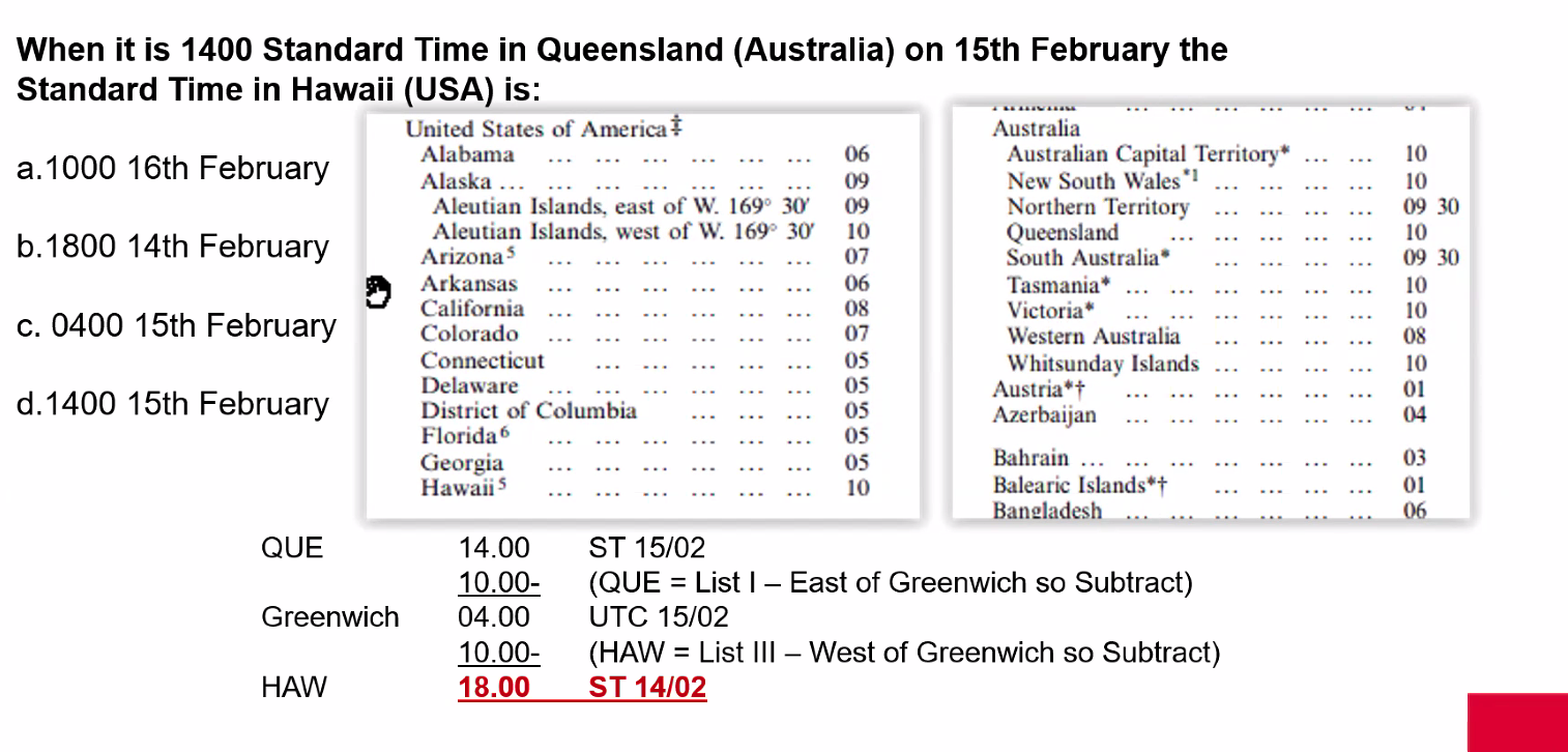 Q. When it is 1400 Standard Time in Queensland (Aus) on 15th February the standard time in Hawaii (USA) is: A. 1800 14th February