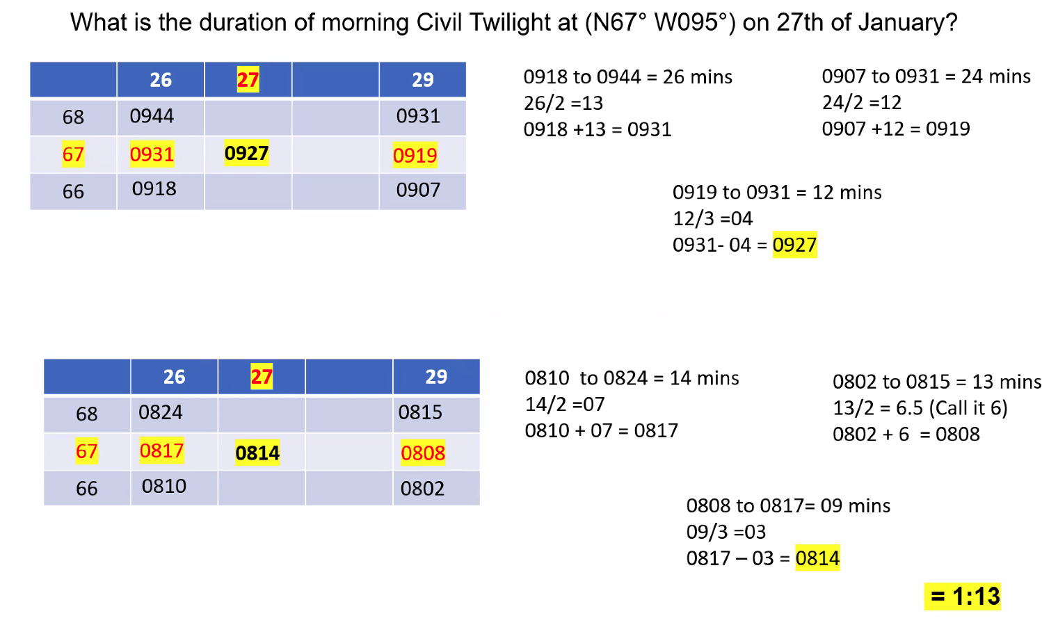 Q. What is the duration of morning Civil Twilight at (N67° W095°) on 27th January? A. 1 hour 13 mins