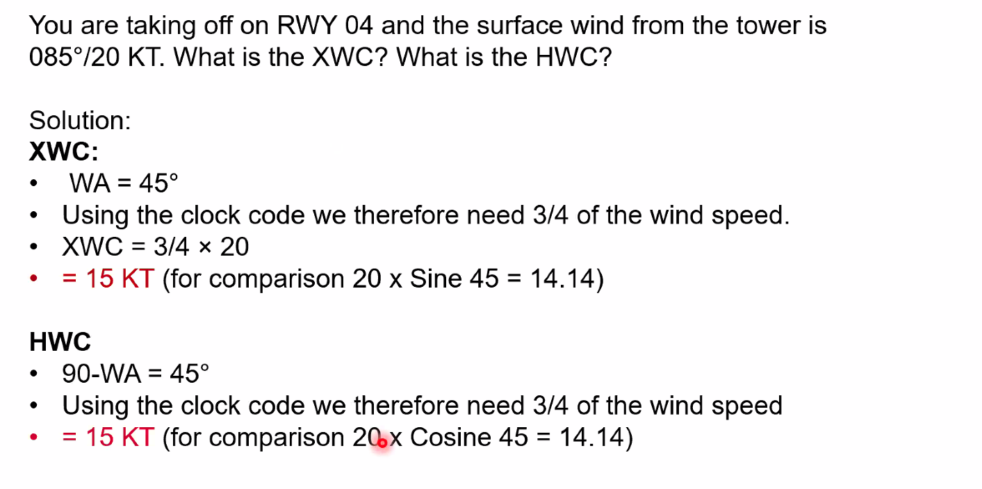 Q. You are taking off on RWY 04 and the surface wind from the tower is 085°/20 kts. What is the XWC? and what is the HWC? A. ==WA = 45°, XWC = 15 KT, HWC = 15 kt==