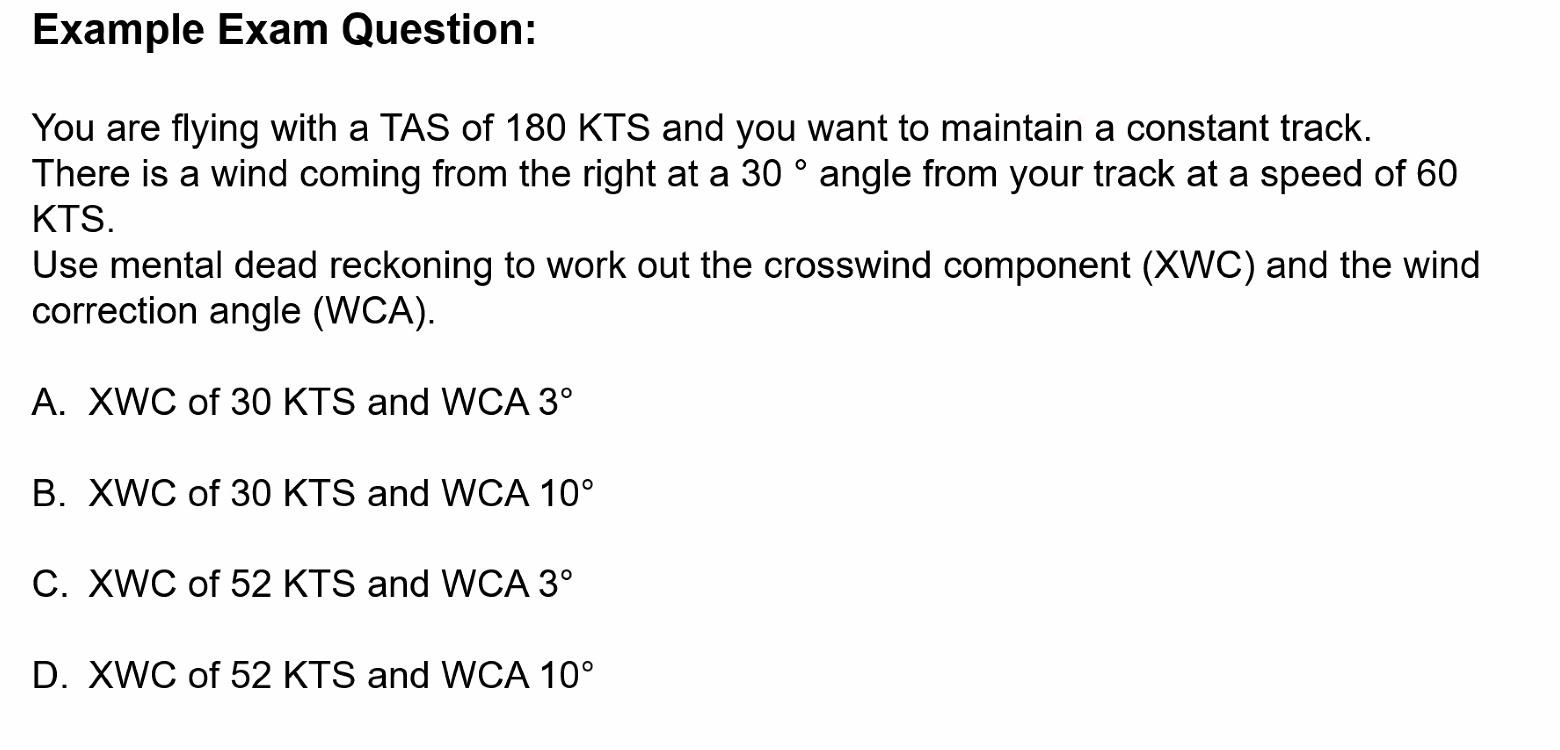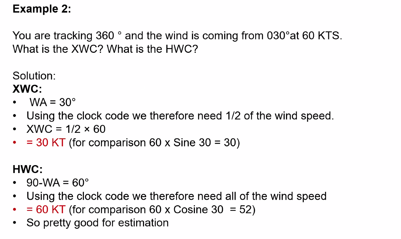 Q. You are tracking 360° and the wind is coming from the 030° at 60 kts. What is the XWC? and what is the HWC? A. ==XWC = 30 kts, HWC = 60 kts==