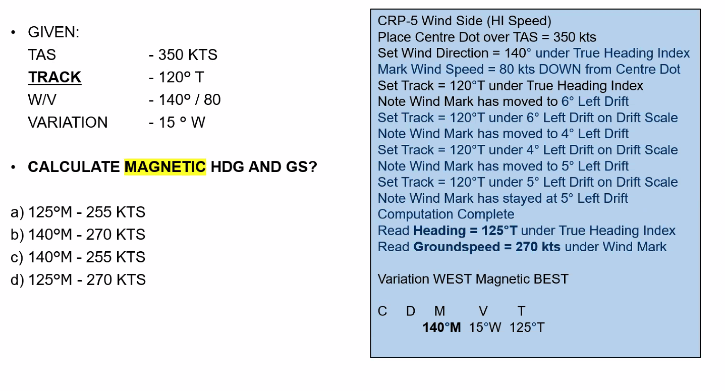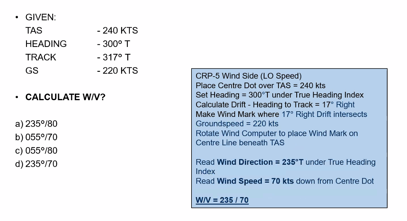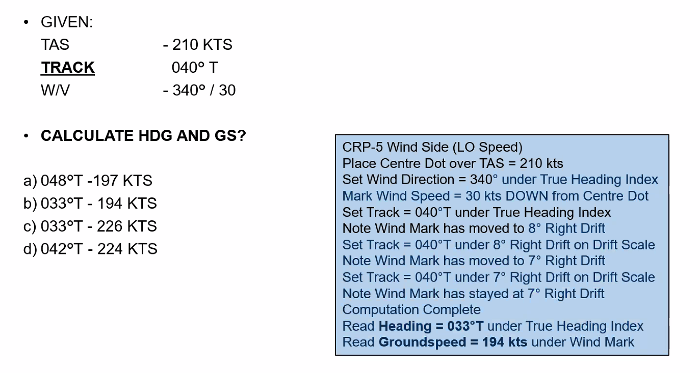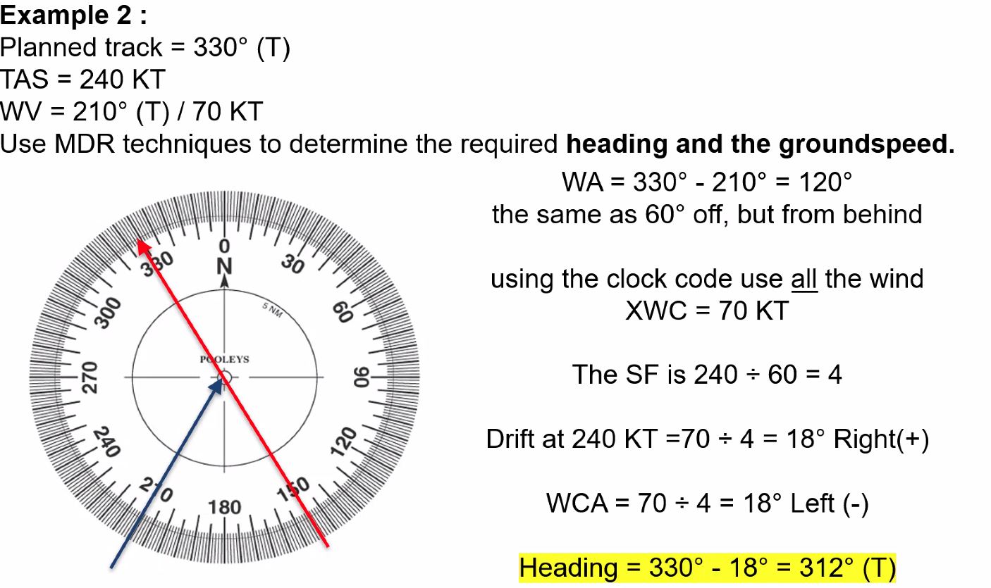 Q. Planned Track = 330°T, TAS = 240 KT, WV = 210°T / 70 KT. Use MDR techniques to determine the required heading and the groundspeed.