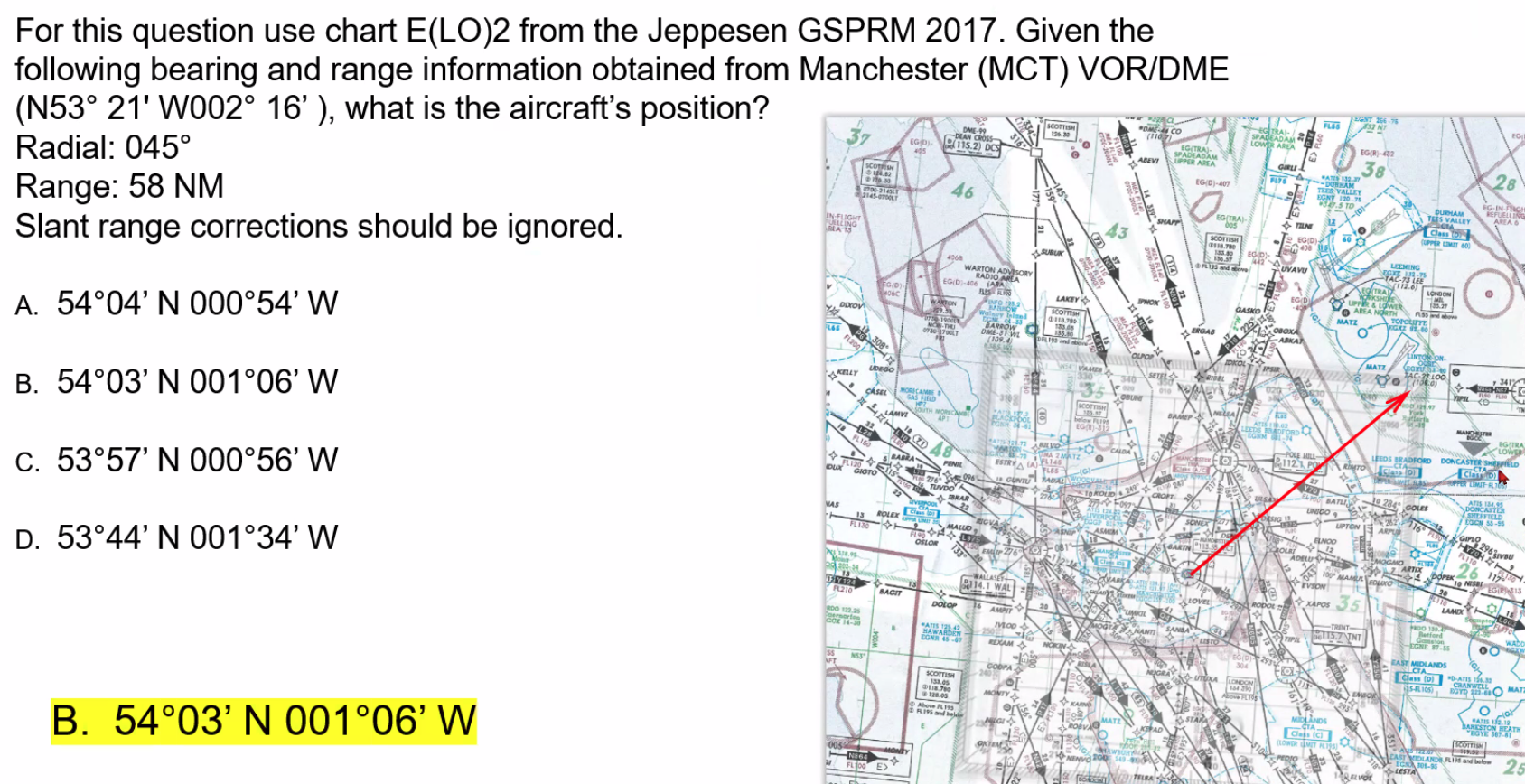 Q. An aircraft at position 60°N 005°W tracks 090°T for 315 km. On completion of the flight the longitude will be: