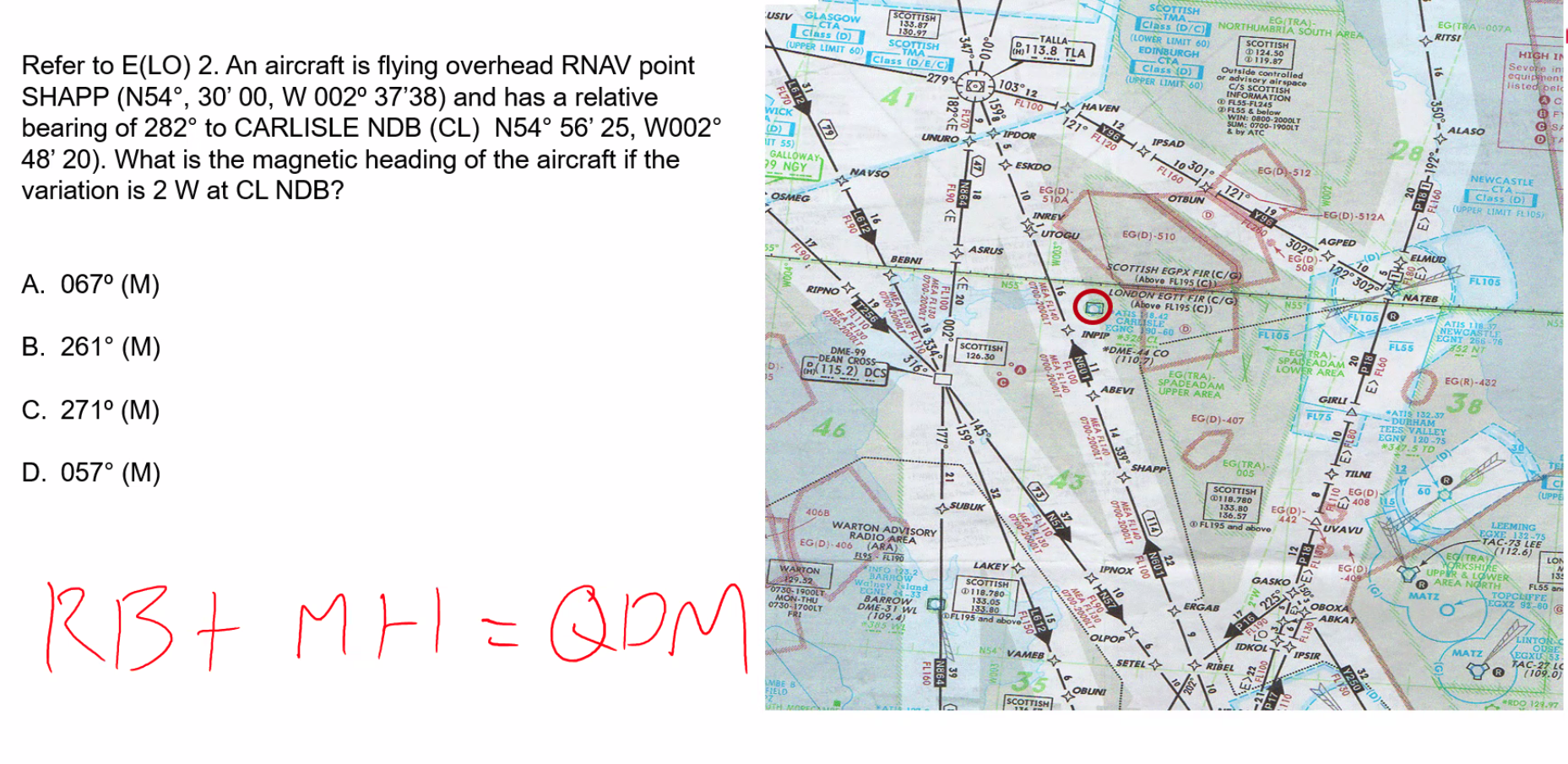 Q. If the compass heading is 265°, variation is 33°W and deviation is 3°E, what is the true heading? A. 235°