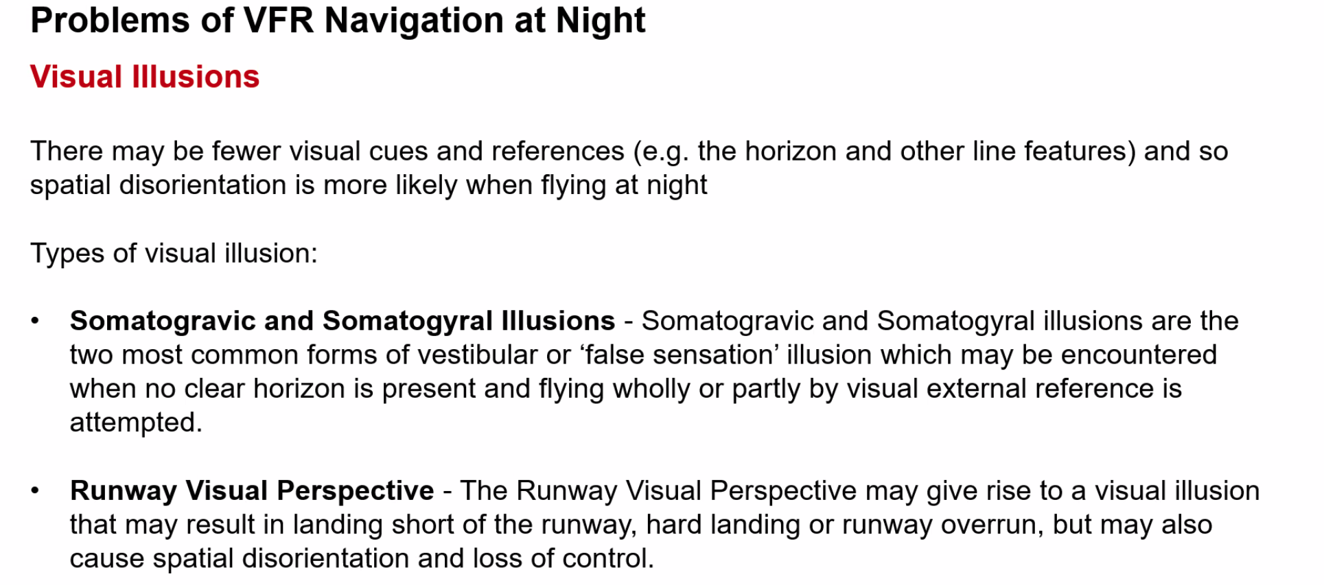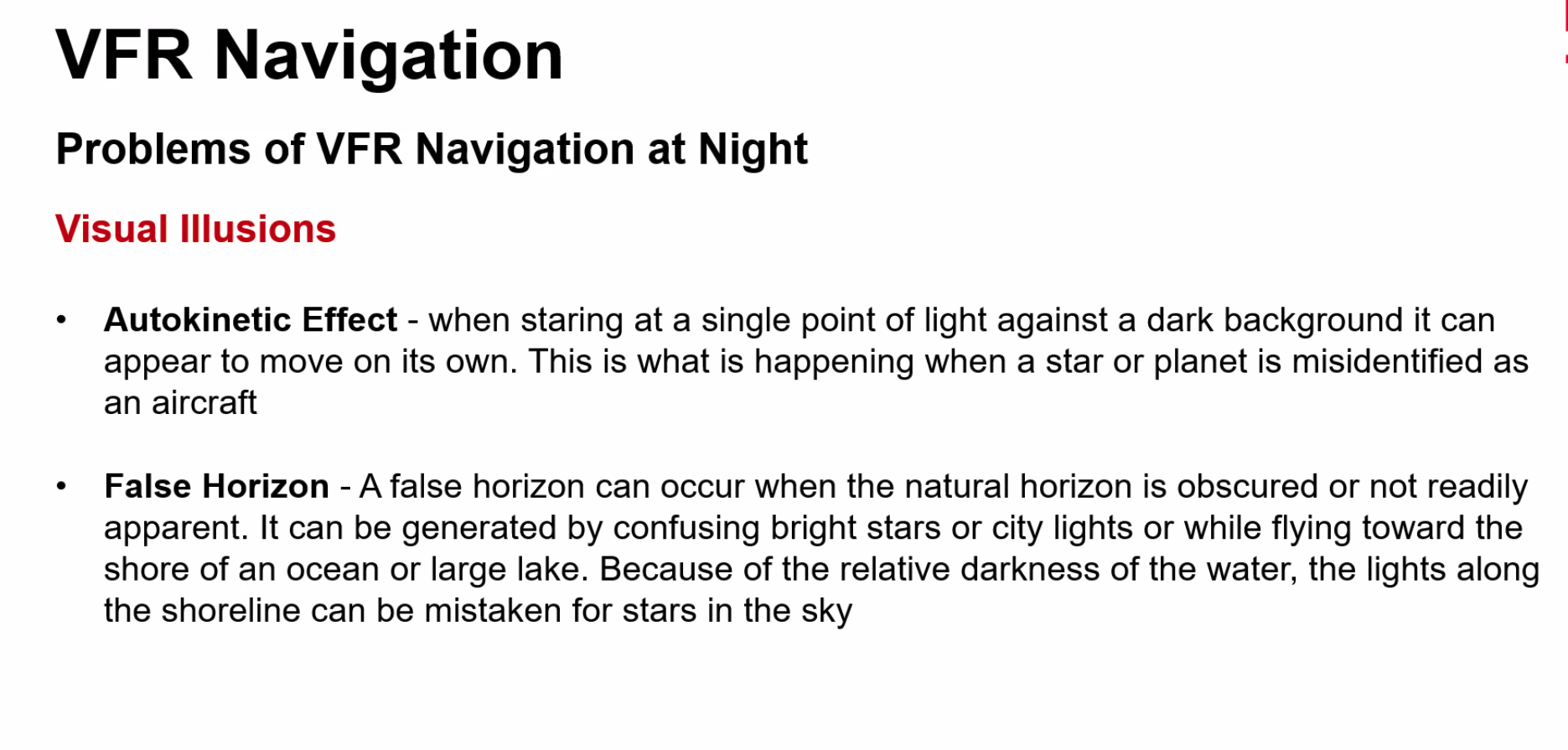 ==Q. Which option describes the greatest potential threat for VFR navigation at night?== A. The aircraft height during an approach can be easily misjudged due to insufficient visual cues
