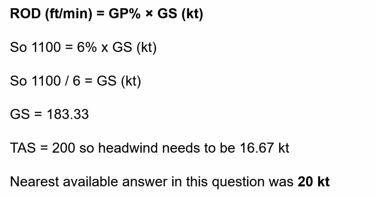 ==Q. Your rate of climb is calculated as 1100 feet per minute at a TAS of 200kt. At that airspeed, what minimum headwind component is required to achieve a climb gradient of 6%?==