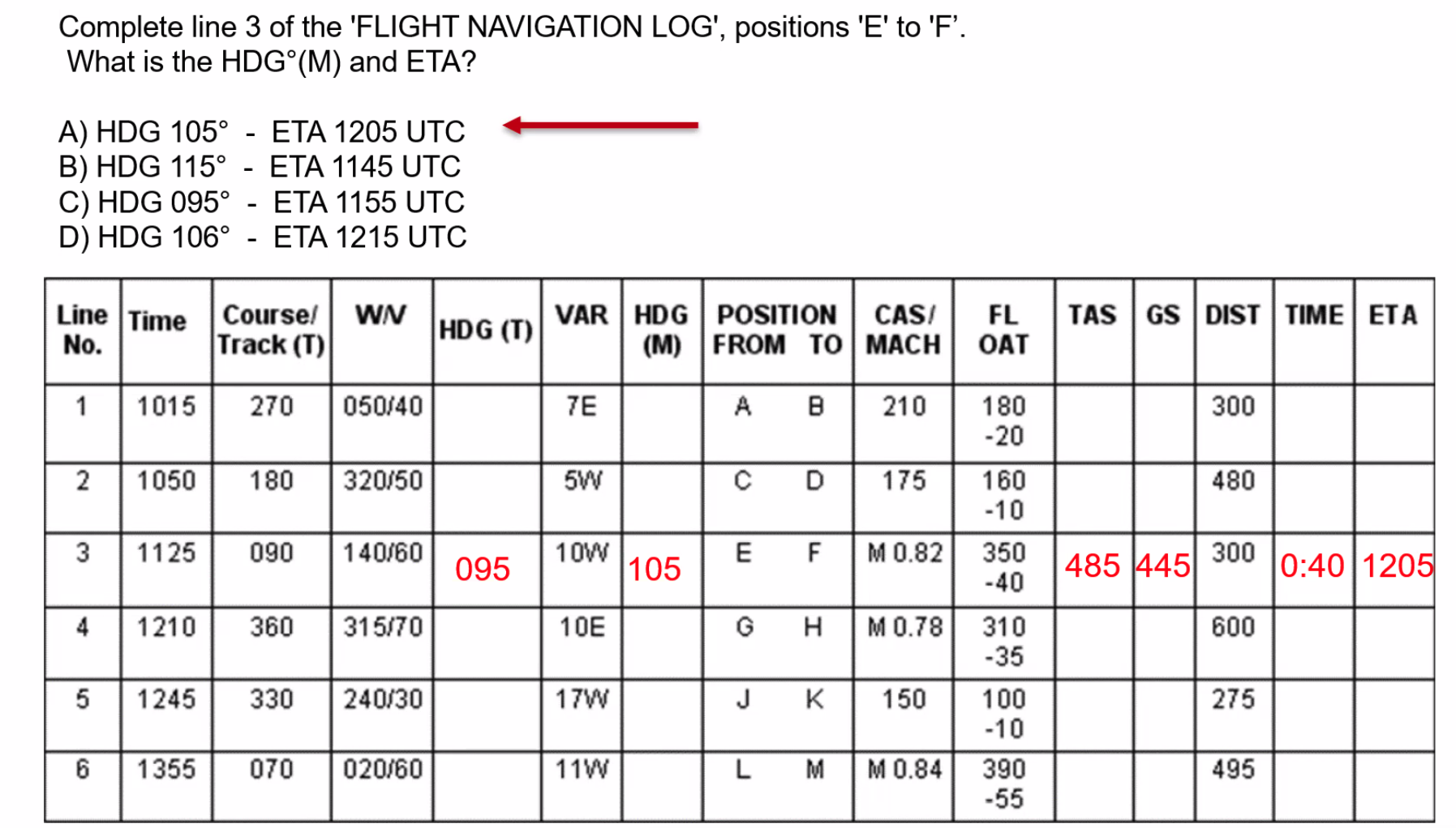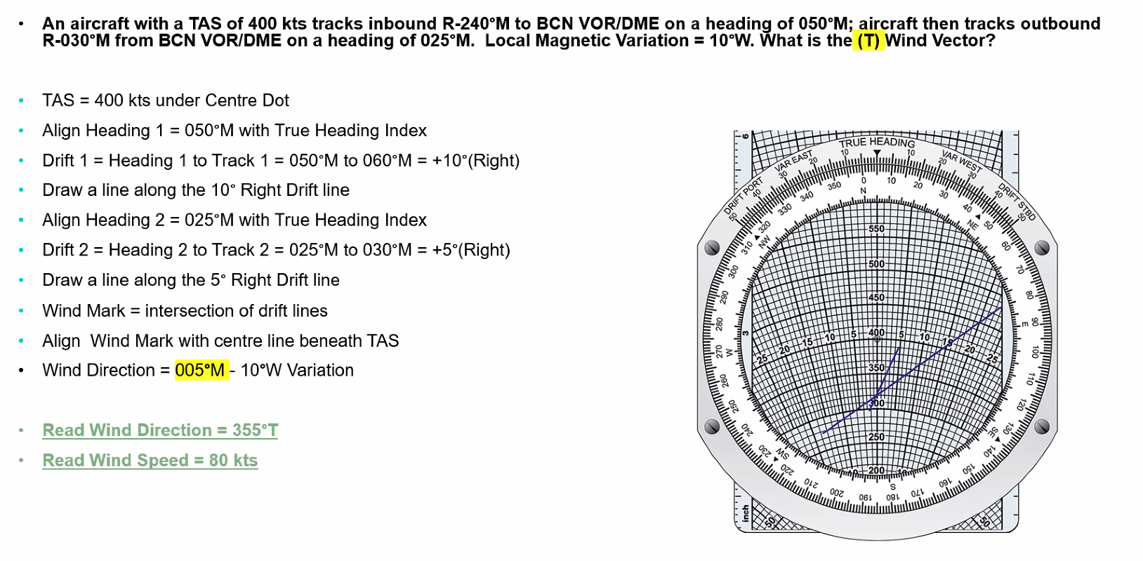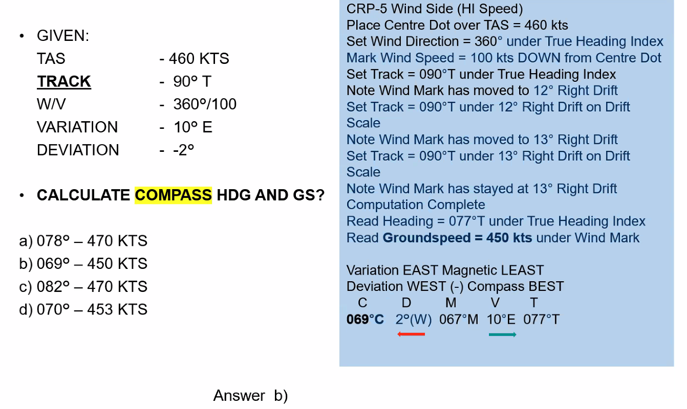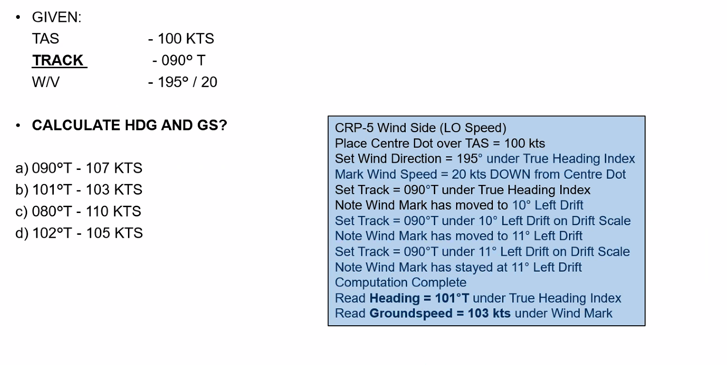 Q. Planned Track = 070°T, TAS = 400 KT, WV = 100°T/20 kt. Using MDR Techniques determine the required heading and the groundspeed. A. ==3° right WCA, Heading = 070° + 3° = 073°==