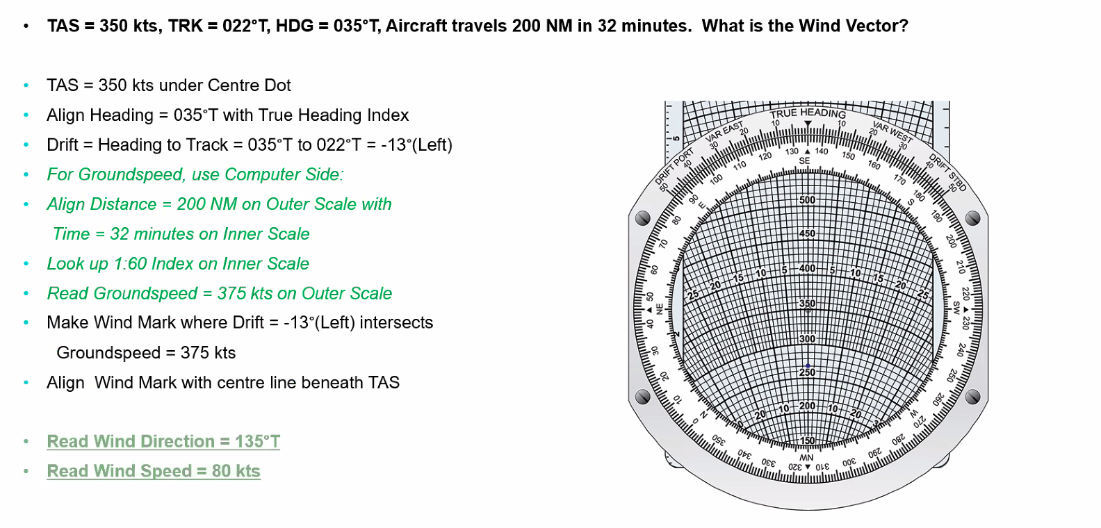 Remember on the HWC we need to minus the Wind Angle from 90°. 90° - 30° = 60°. 60° = 90% of wind, 60 × 0.9 = 54 kts 240 - 54 = 186 kts